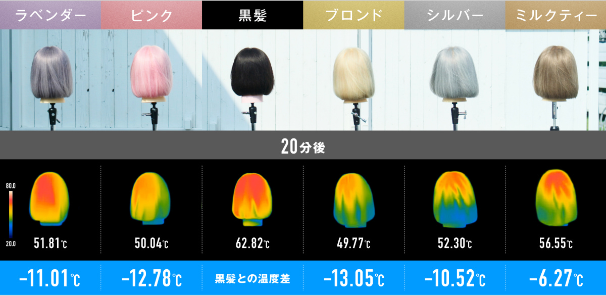 got2bの検証では、黒髪はハイトーンカラーよりも熱がこもりやすく、髪の表面温度が最大13.05℃高い*